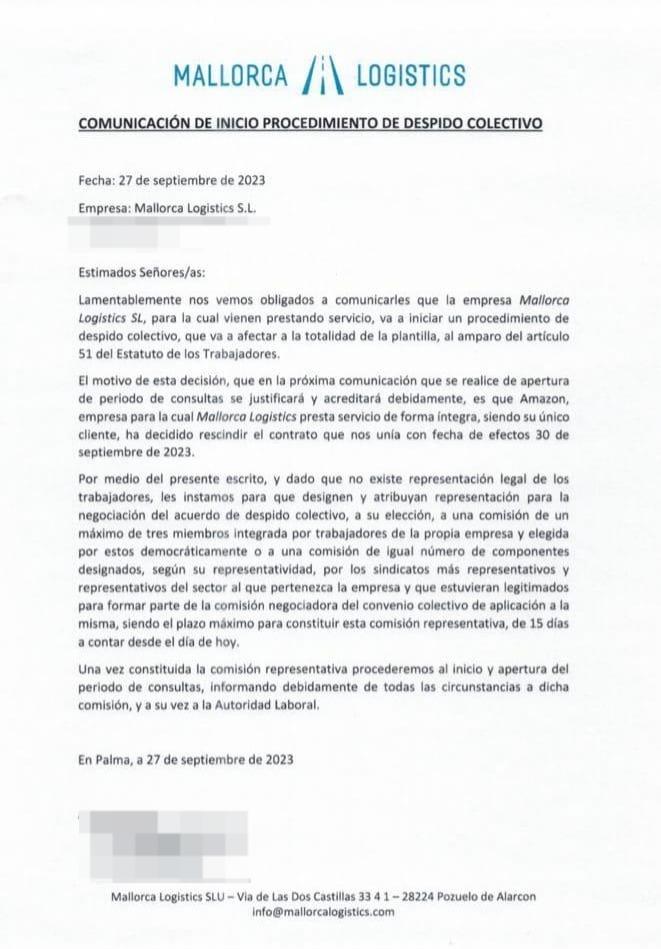 „Wir sehen uns leider gezwungen, Ihnen mitzuteilen, dass das Unternehmen Mallorca Logistics S.L., für das es Dienstleistungen erbringt, ein kollektives Entlassungsverfahren einleiten wird, von dem die gesamte Belegschaft gemäß Artikel 1 des Arbeitnehmerstatuts betroffen sein wird“, heißt es in dem Kommuniqué, das an die von dieser Maßnahme Betroffenen verschickt wurde. Das Unternehmen begründet diese Maßnahme damit, dass „Amazon, das Unternehmen, für das Mallorca Logistics S.L. als einziger Kunde alle Dienstleistungen erbringt, beschlossen hat, den Vertrag, der uns verbindet, mit Wirkung zum 30. September 2023 zu kündigen“, heißt es in der internen Mitteilung weiter.