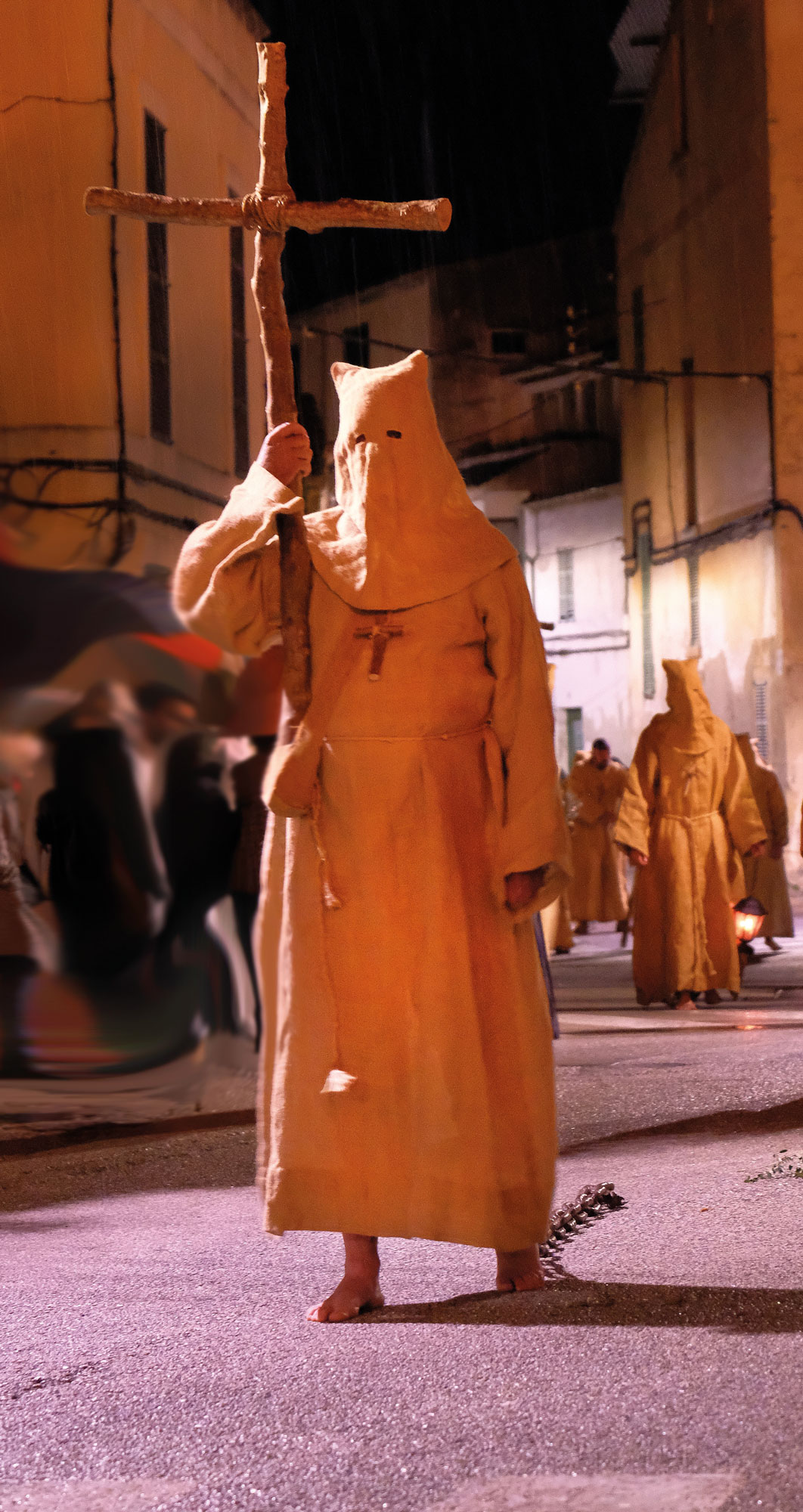 Fast unheimlich wirkt es, wenn die Trommeln zwischen den Häusern widerhallen und sich die Nazarenos in ihren langen Gewändern mit brennenden Fackeln einen Weg durch die Menge bahnen. Ihnen folgen die Penitentes, die Büßer, die als Zeichen ihrer Buße ein Holzkreuz auf den Schultern tragen oder barfuß schwere Ketten über den Boden ziehen.